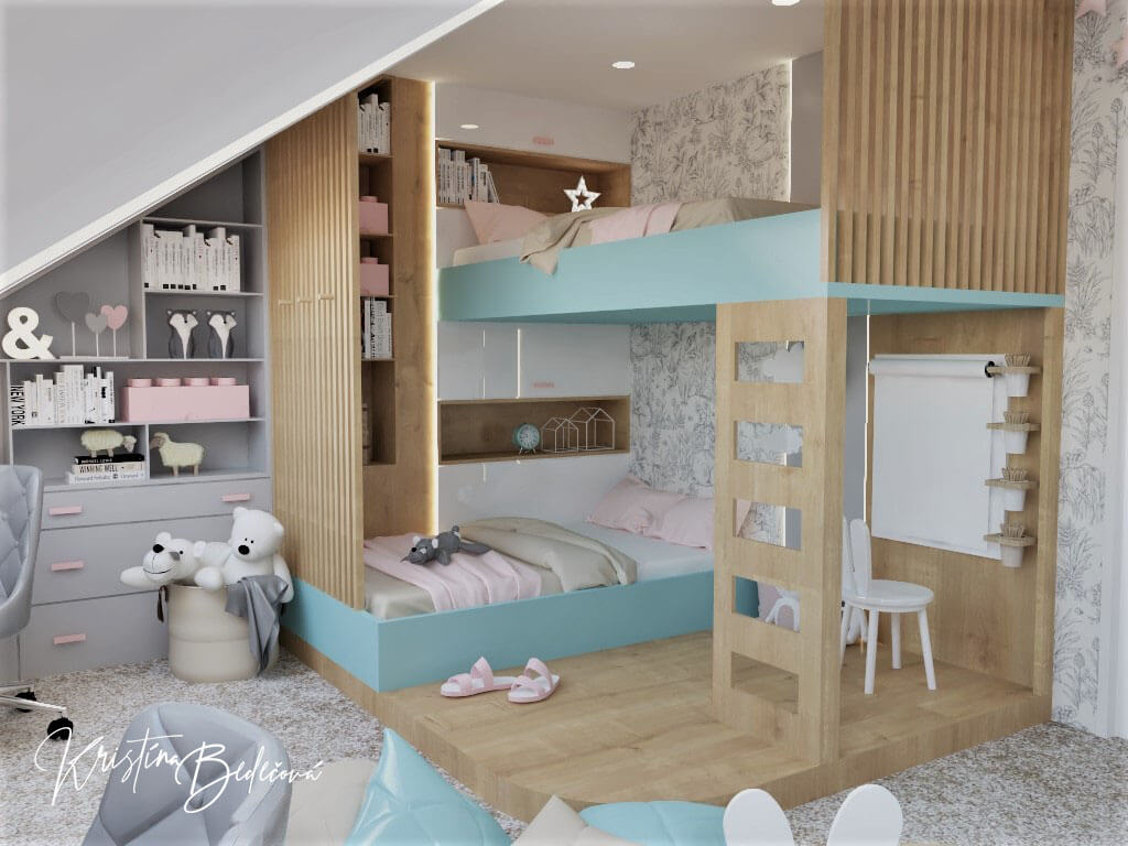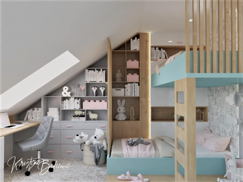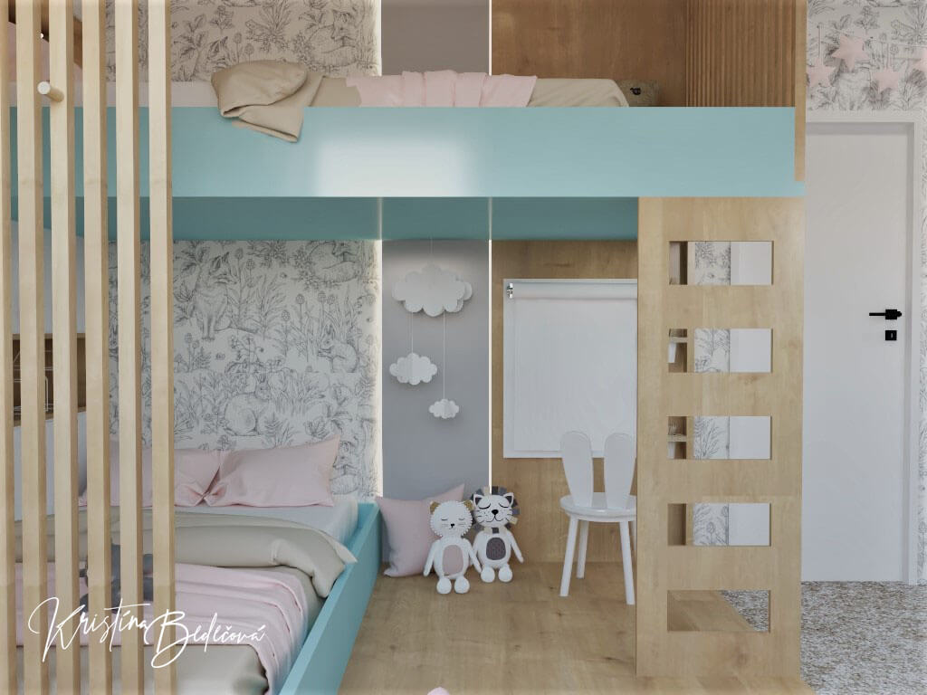 Izba je pomerne veľká a tak sa do nej zmestilo všetko čo dievčatám treba. Každá má svoj spací kútik, písací stolík a spoločný priestor na hranie čomu sa určite potešia. Na vrchnej posteli bude spávať staršia dcéru, preto nebolo potrebné po bokoch navrhnúť zábrany. Mladšej som pod posteľou urobila kresliaci a hrací- oddychový priestor ako by sa aj mne páčil. Aby som im dopriala troška súkromia, postele oddeľujú drevené hranoly. Spodnú časť postelí som navrhla modro tyrkysovú a ružovú pre druhú dcéru som navrhla na dekoráciách a posteľných obliečkach. Viac farebných prvkov som im tam nedávala, nakoľko aj hračky, knižky sú farebné aby to nepôsobilo príliš farebne. Na stenu kde sú dvere som použila bielo- sivú tapetu so zvieratkami, ktorá je veľmi neutrálna, ale zároveň izbu jemne oživí svojim vzorom.