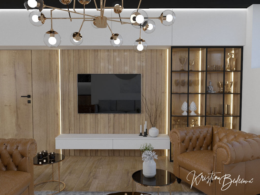 V obývačke sú najvýraznejším prvkom dve Chesterfield kresielka v koňakovej koži. Keďže sú masívnejšie, použila som ich nie ako jednu sedačku, ale práve ako kresielka, ktoré vyplnia funkčne ponúkaný priestor obývačky. Konferenčný stolík je celý zlatý/medený, doplnený o prídavné kruhové stolíky, ktoré si vedia domáci posúvať ako príručné stolíky, kde budú potrebovať. TV tenu som navrhla ako minimalistickú, za TV som použila drevené latovanie, ktoré smerom ku krbu prechádza do hladkého povrchu a sú do neho zapustené aj dvere do spálne. V rohu som navrhla vitrínu so sklom, pretože ju chcela pani domáca. V každom prípade vyzerá veľmi pekne a zútulňuje priestor, obzvlášť krásne vyniká v kombináciami s kreslami. Podsvietila som ju žltými LED pásmi.